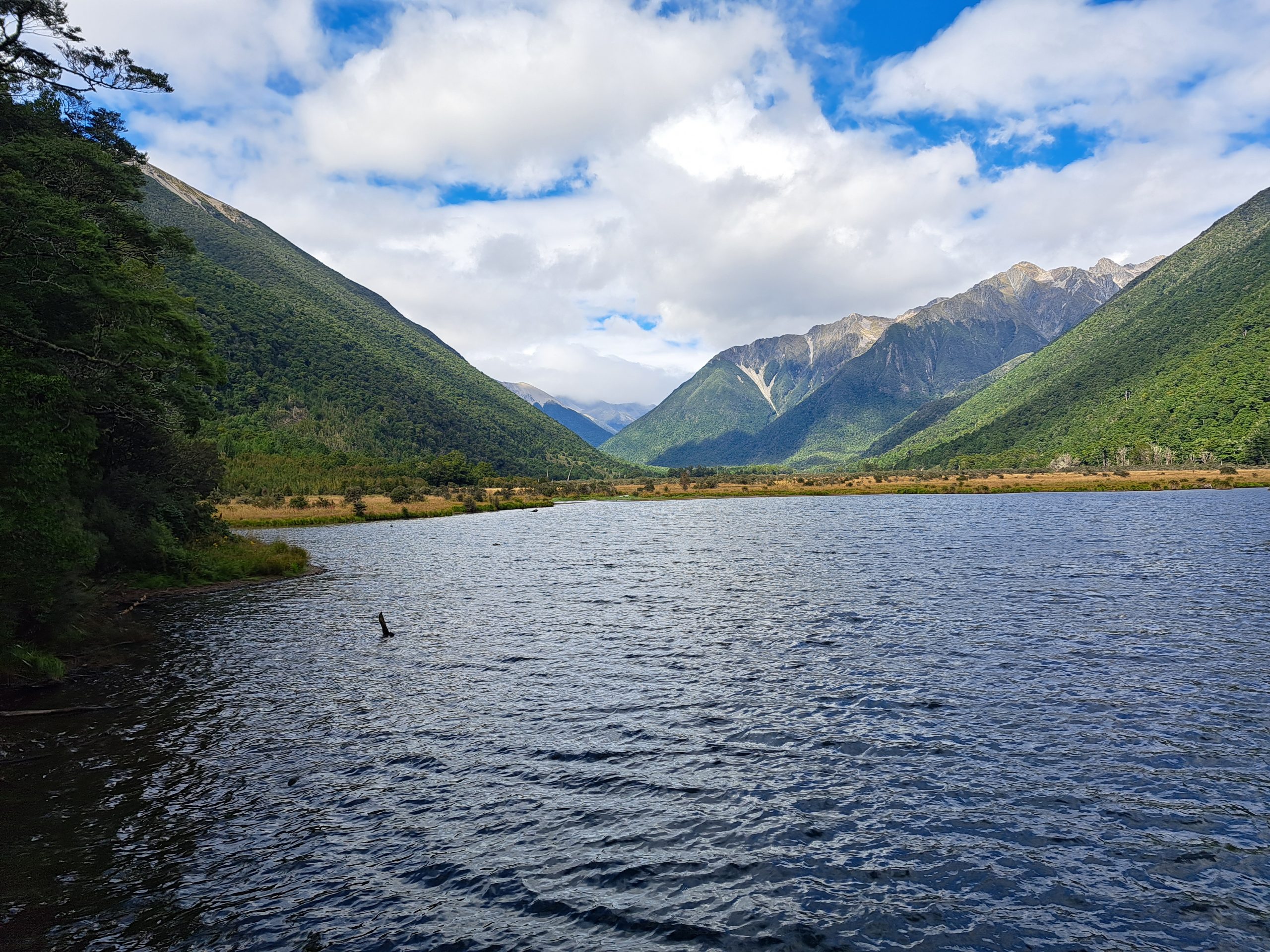 ‚Gabrielle‘ hat die Südinsel verschont und ist östlich vorbeigezogen. Ich habe meinen Weg fortgesetzt, ab heute wandere ich für ein paar Tage durch den Nelson Lakes Nationalpark. Zu Beginn führte mich der Weg entlang des Ufers von Lake Rotoiti und durch das Mündungsgebiet vom Travers River.