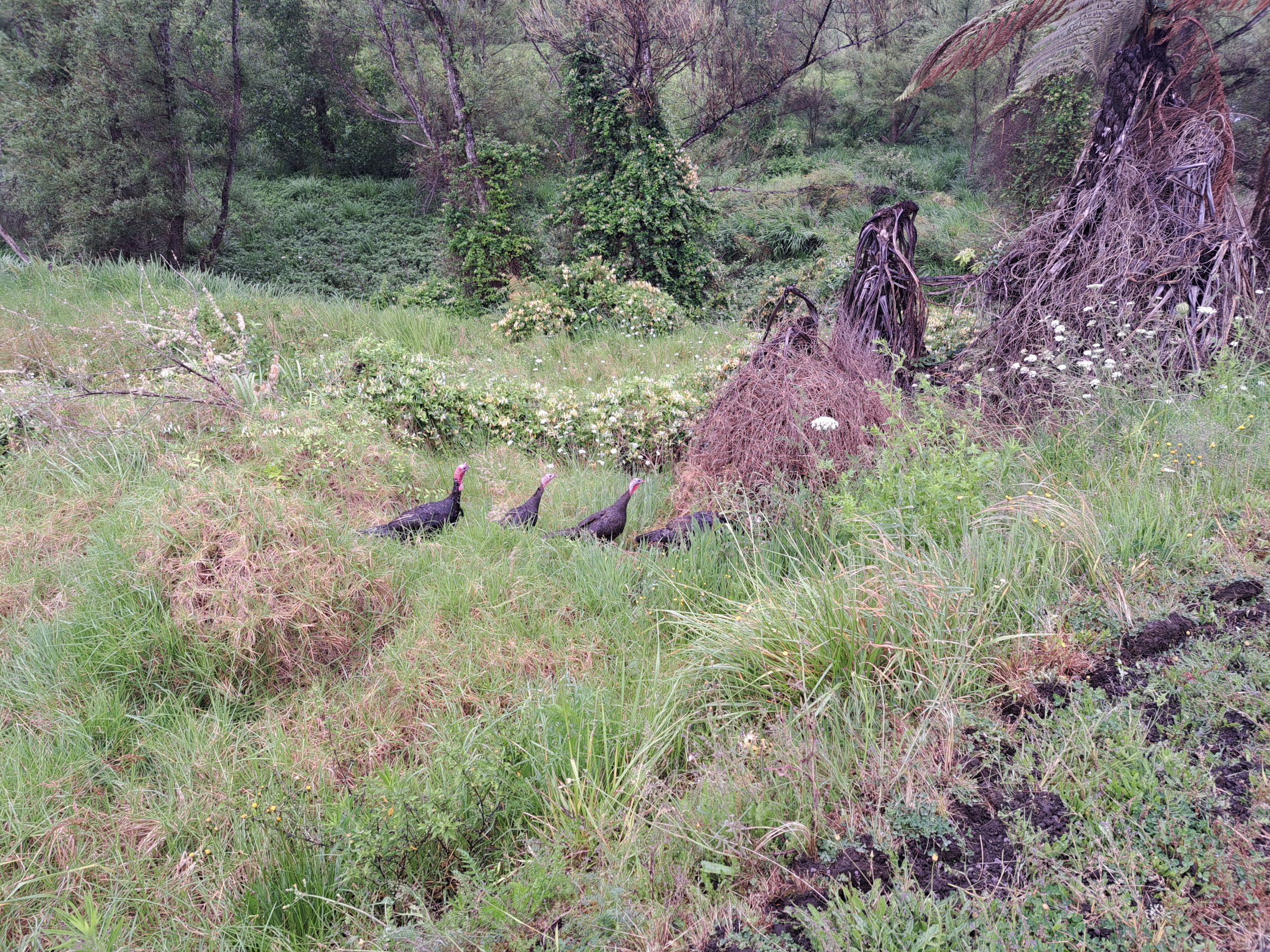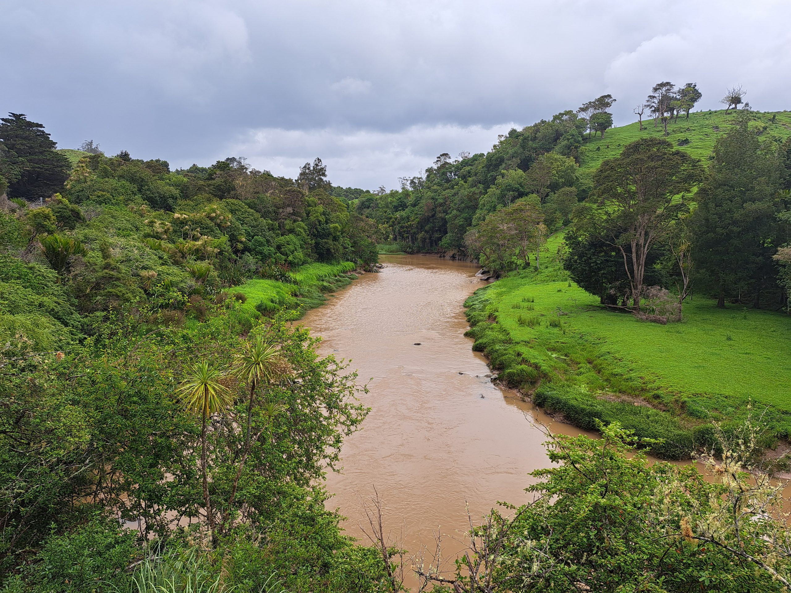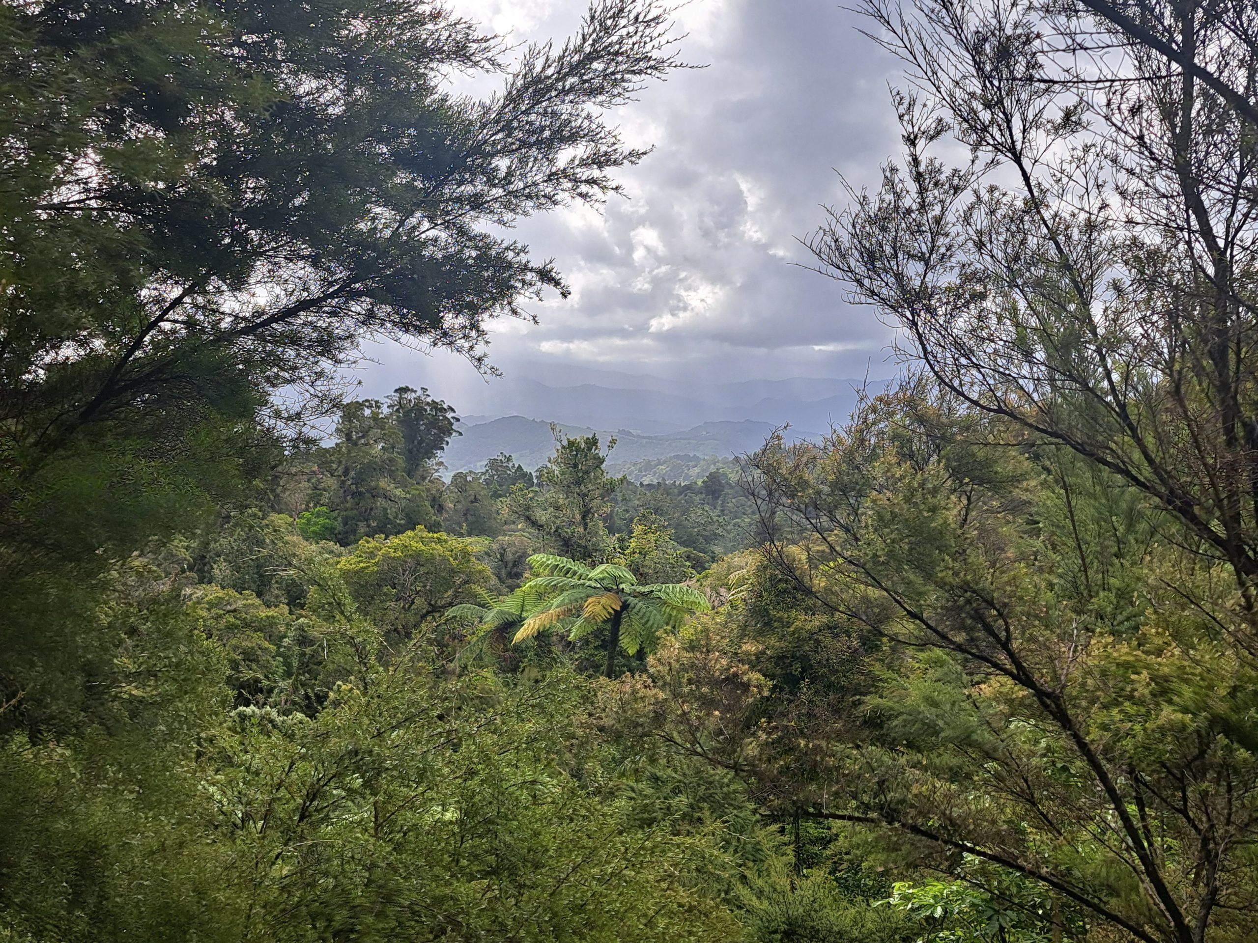 Der Raetea Forest Track ist leider gesperrt, also führt die Strecke heute entlang einer wenig befahrenen Straße zuerst nach Mangmui. Auf den Wiesen unterwegs sind viele Rinder, aber auch wild lebende Truthähne. Das scheint also hier kein beliebtes Weihnachtsessen zu sein ;-). An der Straße treffe ich Greg, der mich einen kurzen Moment später auf einen Kaffee einlädt. Er ist (geschätzt) über 70 und hat sich hier sein ‚Last Resort‘ geschaffen. Ein Haus mit sehr gepflegtem Garten und vielen kleinen Kunstwerken. In Mangamui gönne ich mir noch einen ‚Works Burger‘ bevor es weiter in den Puketi Forest geht.