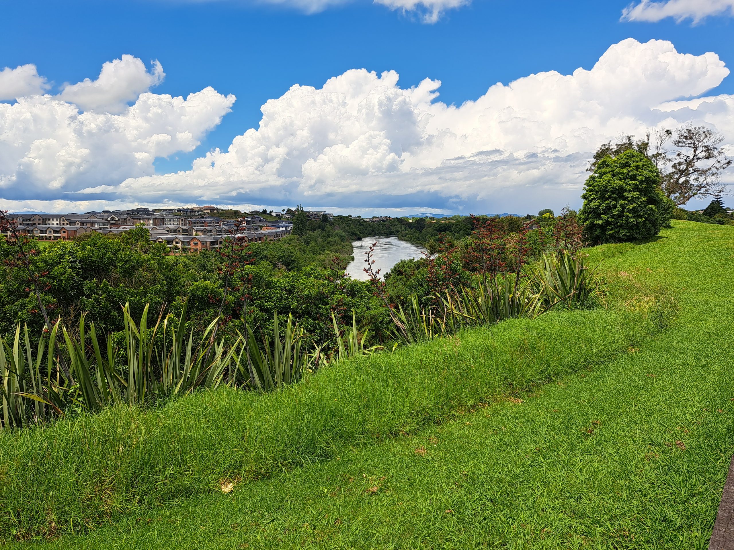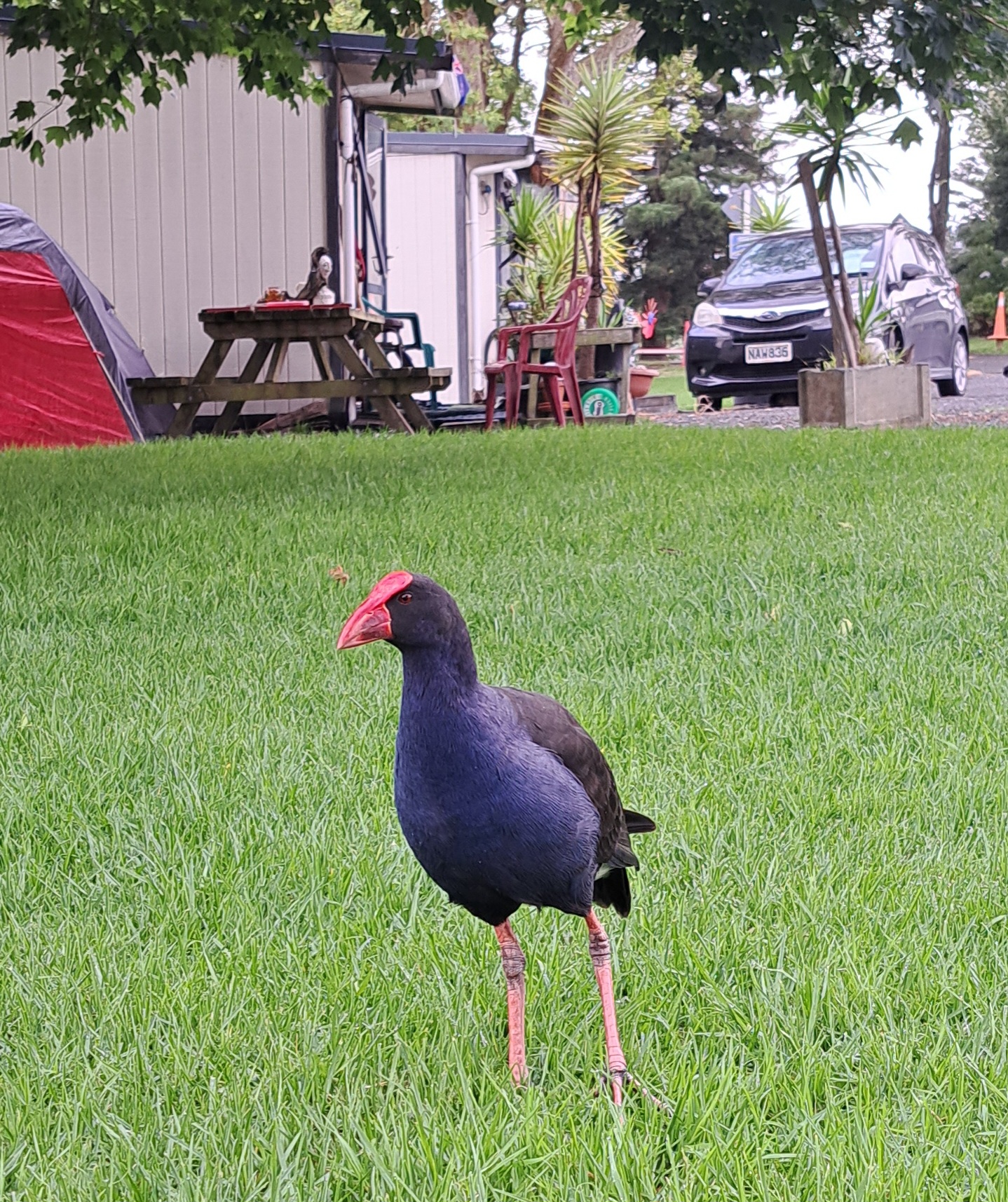 Früh am Morgen werde ich von einem Pukeko am Zelt begrüßt. Sie sind neugierig und untersuchen alles, um herauszufinden, ob es sich nicht doch irgendwie fressen lässt. Meine anschließende Strecke folgt dem Waikato River bis Hamilton. Unterwegs werde ich von einem Gewitter Marke ‚Weltuntergang‘ überrascht, mit Starkregen und Hagel. Nach einer halben Stunde ist der Spuk vorbei und es scheint wieder die Sonne 🙂