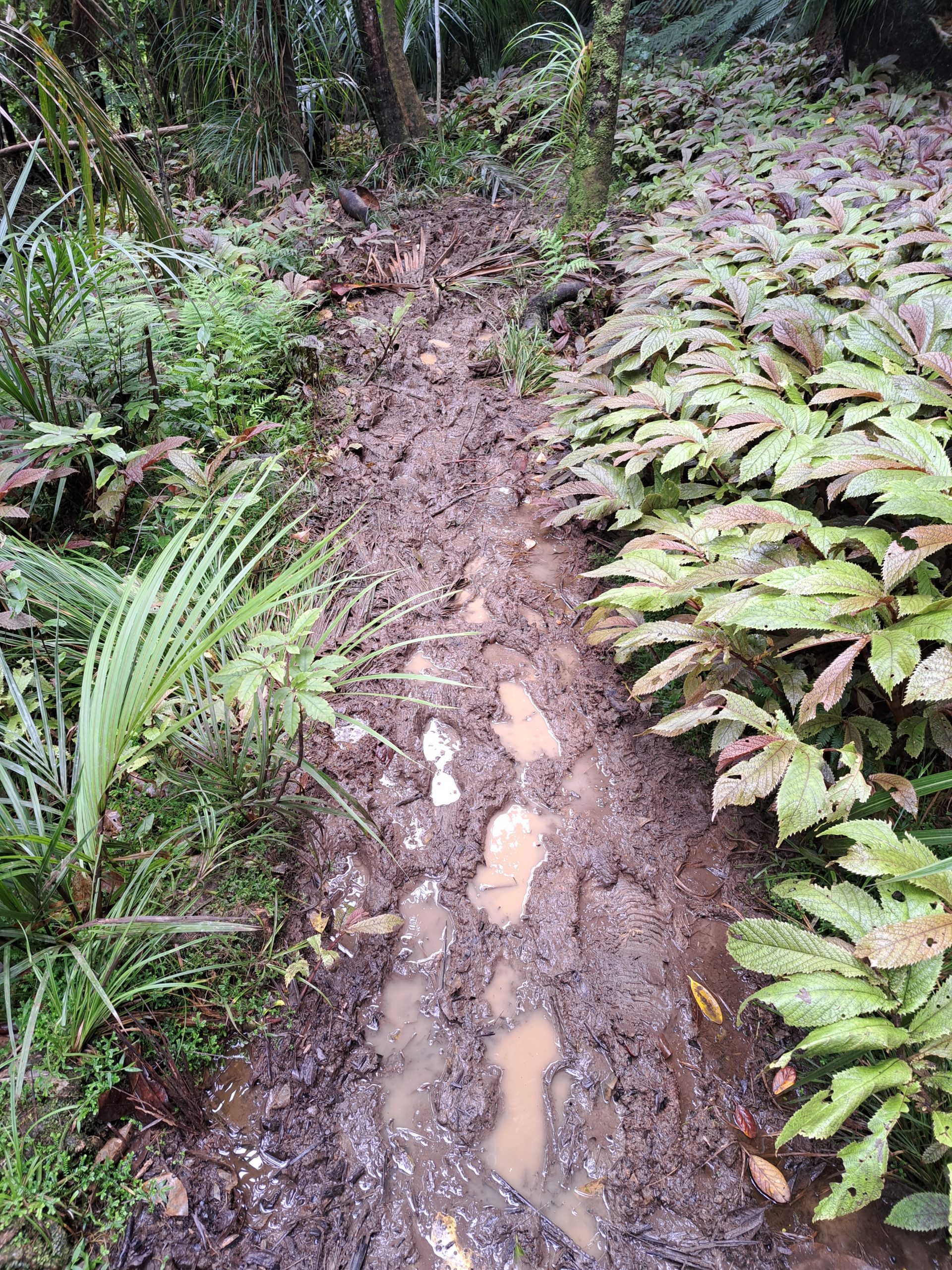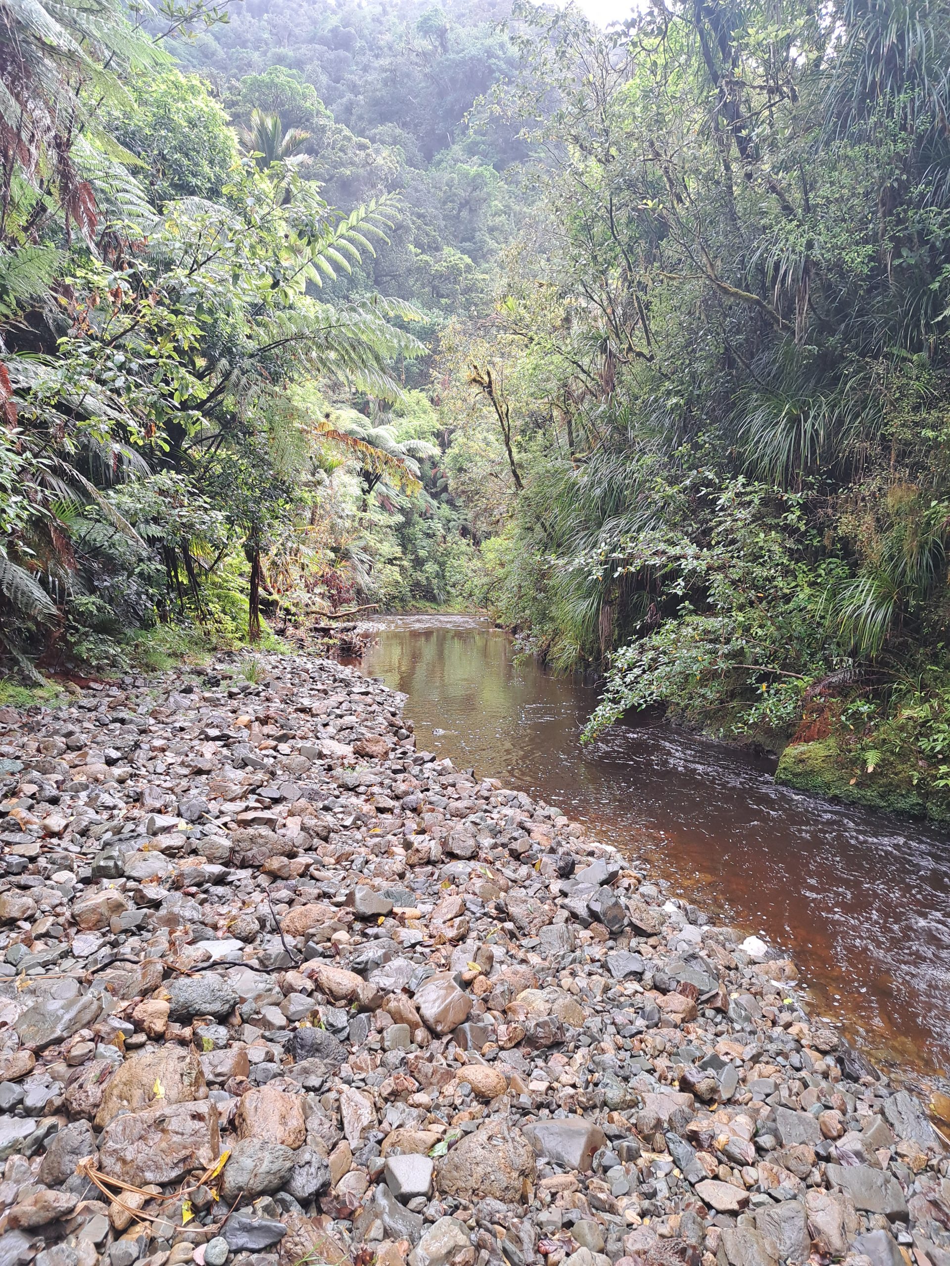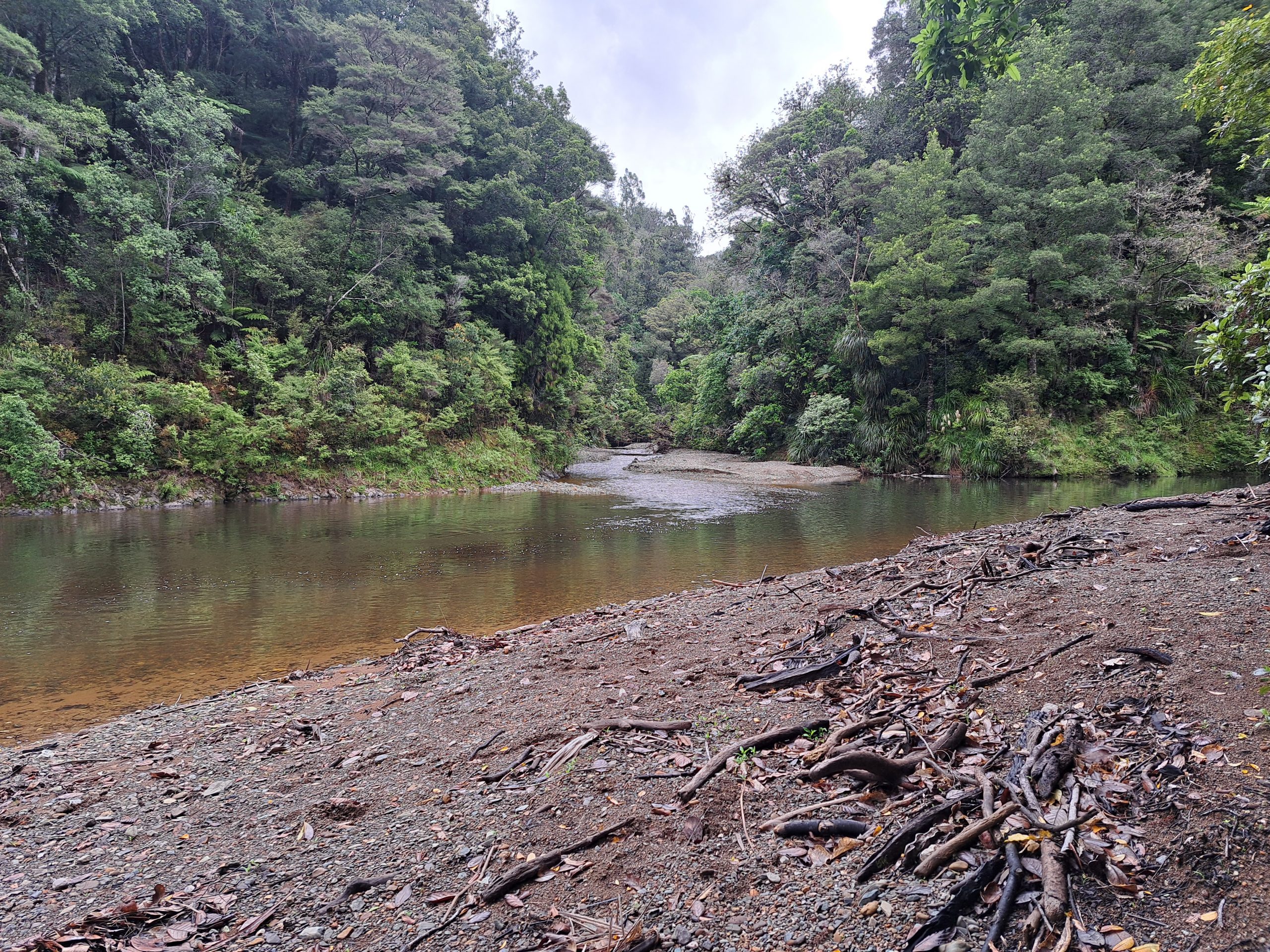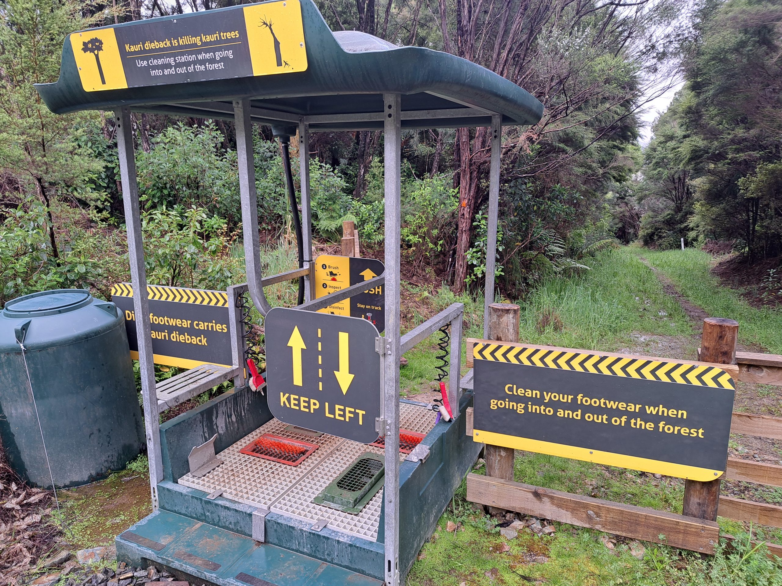 Am Eingang des Puketi Forest Tracks muss jeder in einer Art ‚Waschstrasse‘ seine Schuhe reinigen und desinfizieren. Eine Schutzmaßnahme zur Eindämmung der „Kauri Dieback Desease“, der leider immer mehr dieser majestätischen Bäume zum Opfer fallen. Aber schon bald danach wir der Track schwierig und mehr als einmal sitze ich auf meinem Allerwertesten. Auf den anschließenden Kilometern durch den Fluss werden meine Schuhe und Beine wieder sauber, um gleich danach wieder bis zum Schienbein im Matsch zu stecken. Insgesamt ein anstrengender, aber bisher der schönste, Tag auf dieser Tour.