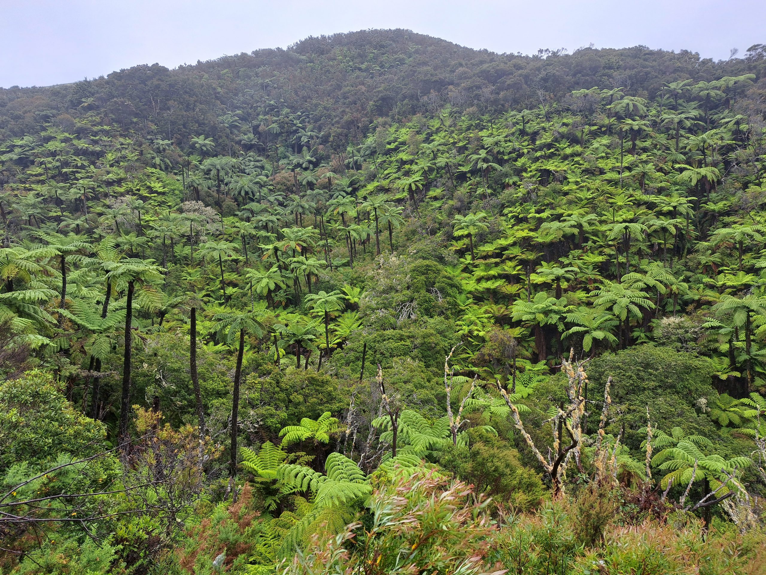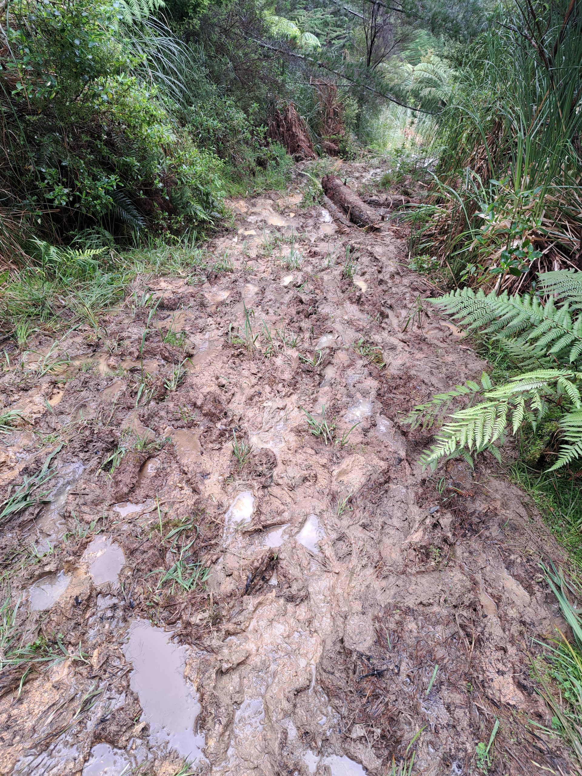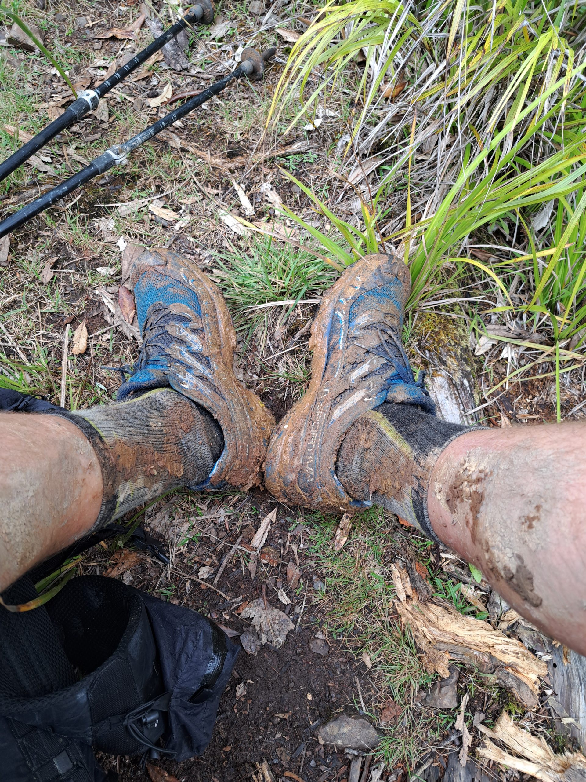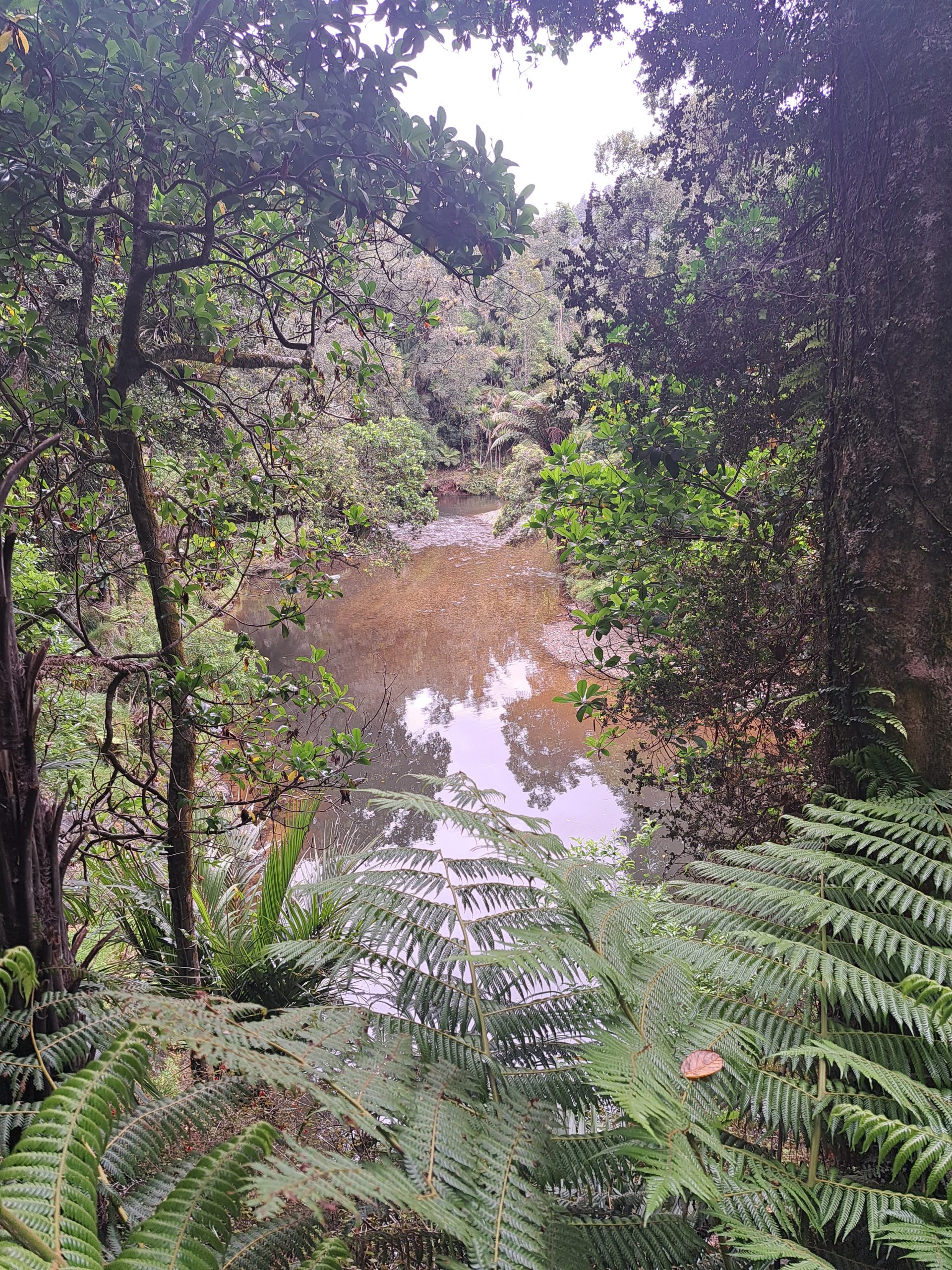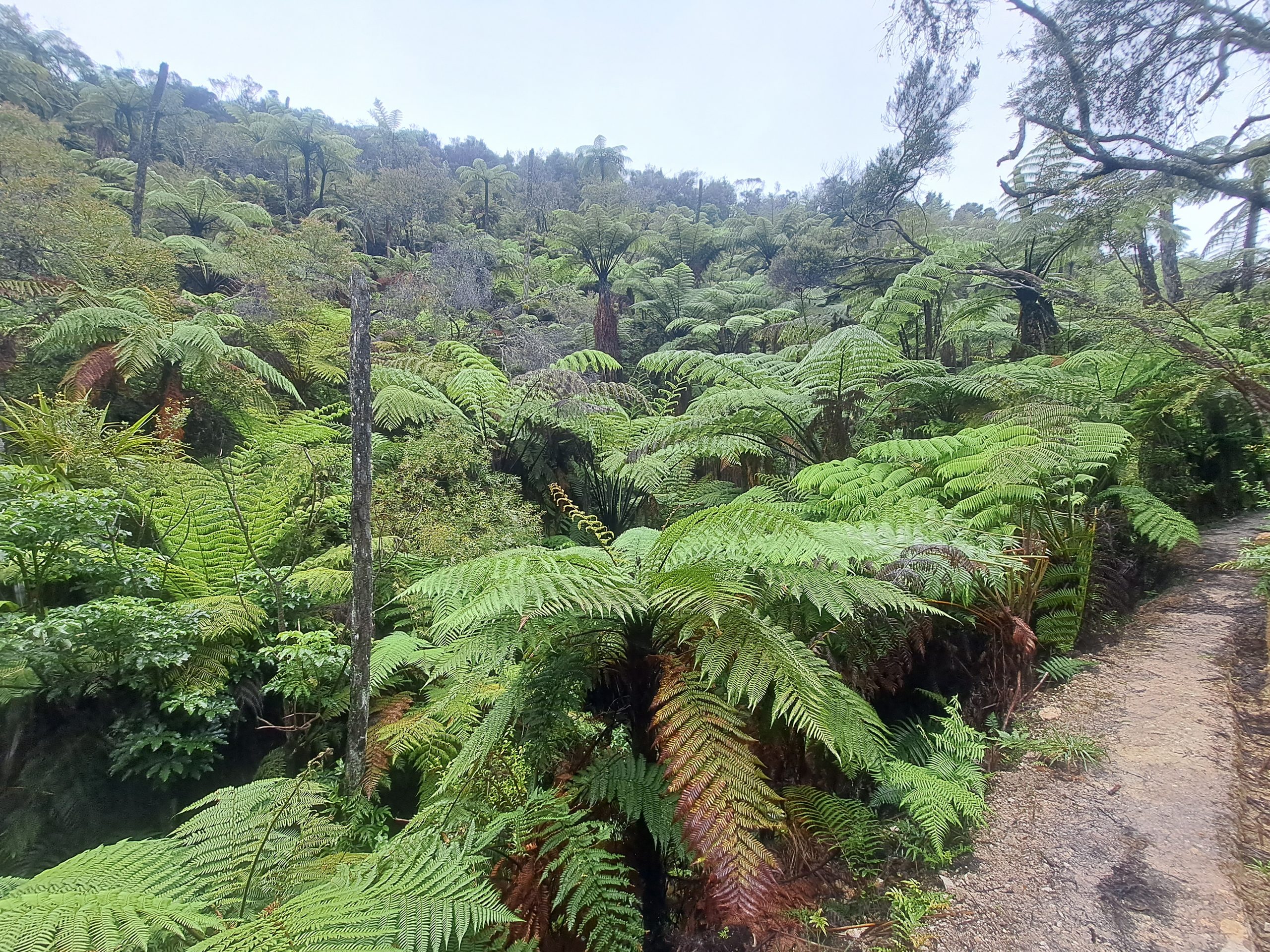 Am Eingang des Puketi Forest Tracks muss jeder in einer Art ‚Waschstrasse‘ seine Schuhe reinigen und desinfizieren. Eine Schutzmaßnahme zur Eindämmung der „Kauri Dieback Desease“, der leider immer mehr dieser majestätischen Bäume zum Opfer fallen. Aber schon bald danach wir der Track schwierig und mehr als einmal sitze ich auf meinem Allerwertesten. Auf den anschließenden Kilometern durch den Fluss werden meine Schuhe und Beine wieder sauber, um gleich danach wieder bis zum Schienbein im Matsch zu stecken. Insgesamt ein anstrengender, aber bisher der schönste, Tag auf dieser Tour.