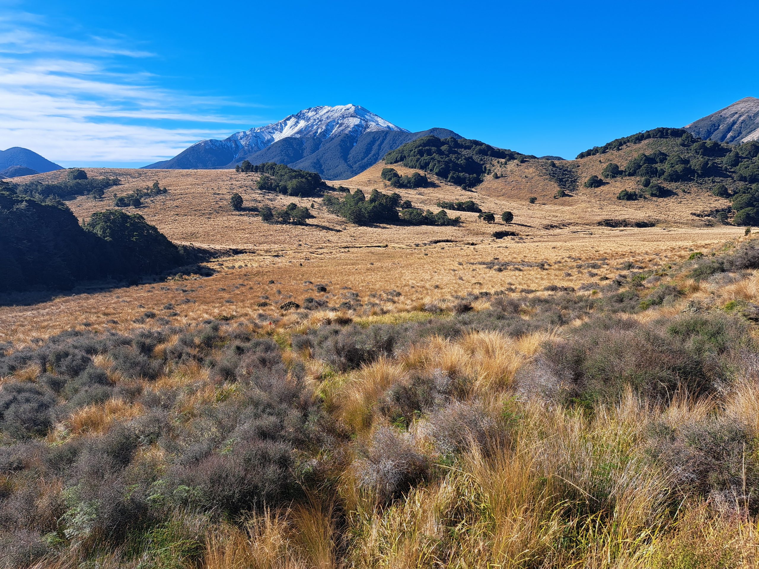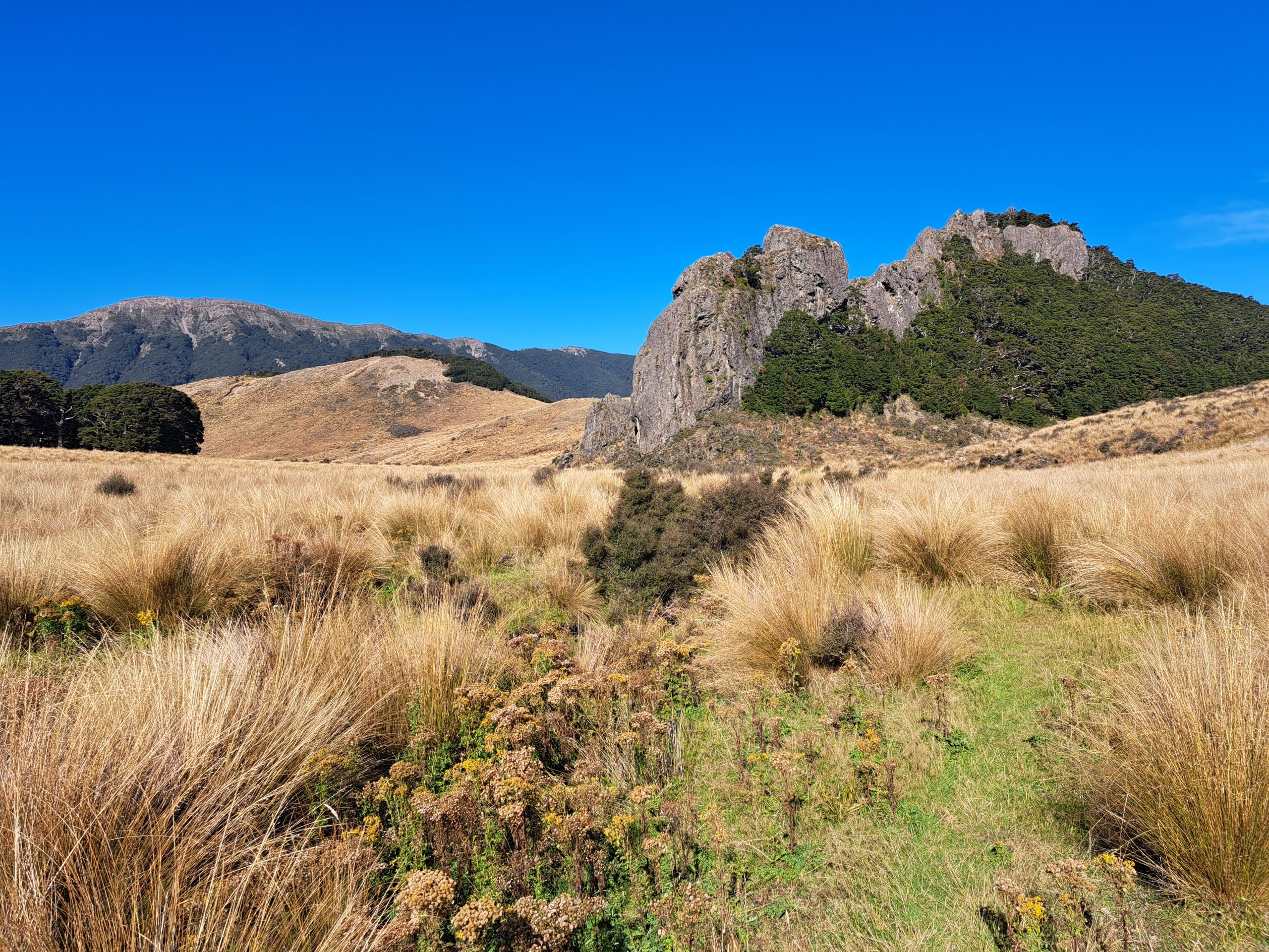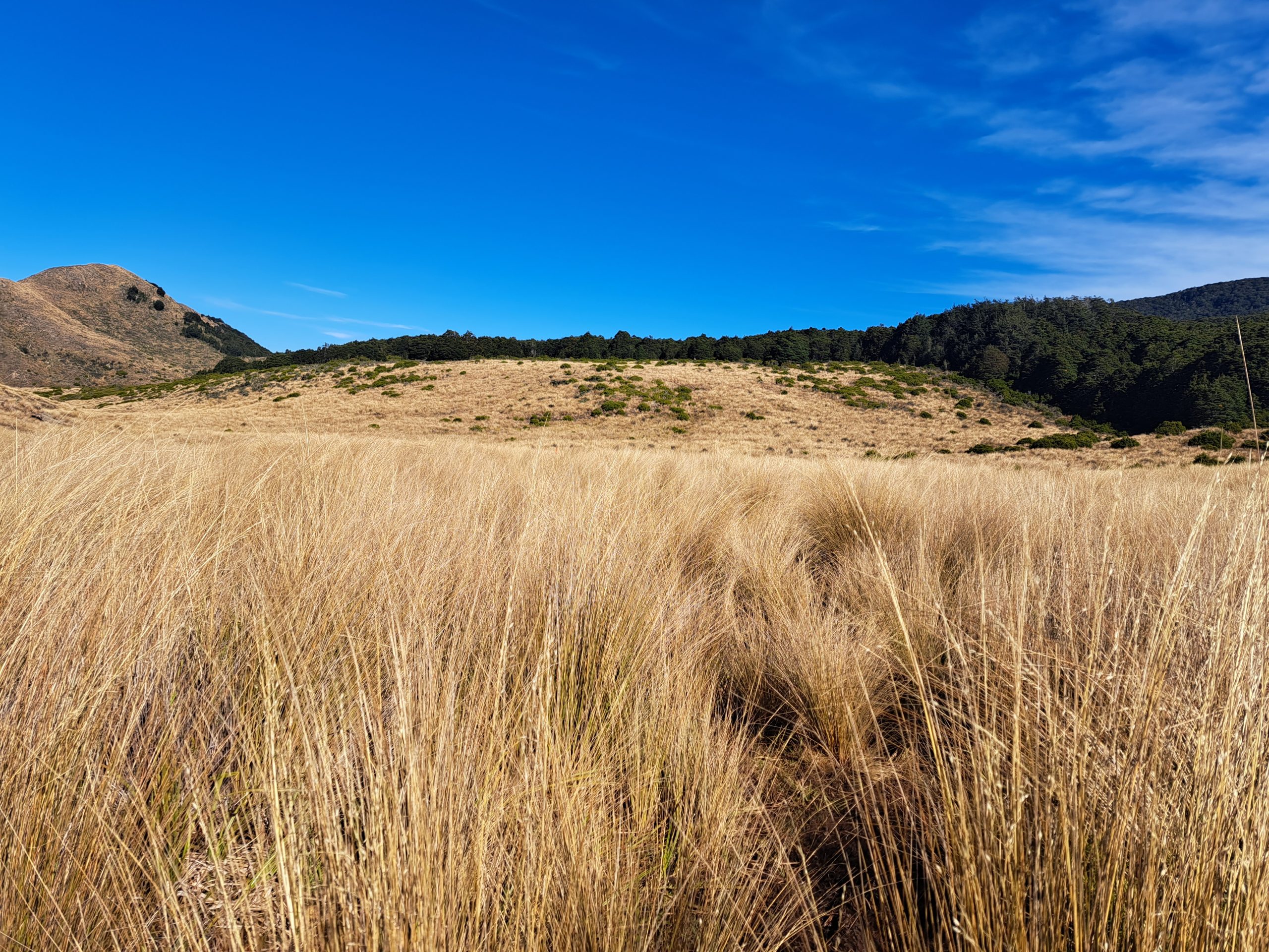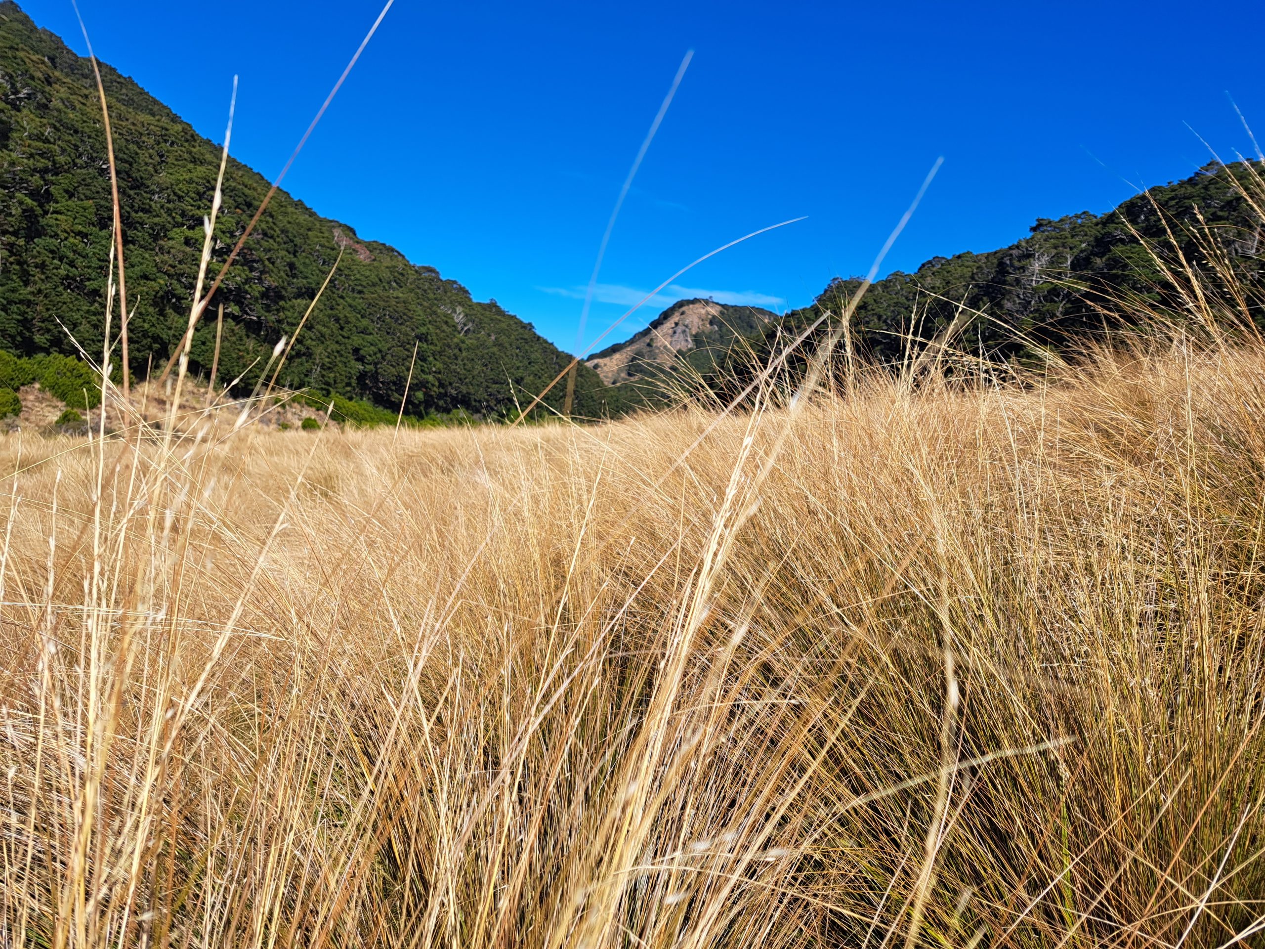 Die Aufgabe des heutigen Tages lautete: Finde den Marker. Die orangen Stangen oder Pfeile waren im hohen Gras versteckt. Die Gräser werden hier ‚Tussock‘ genannt und sind bis zu 1,8m hoch.