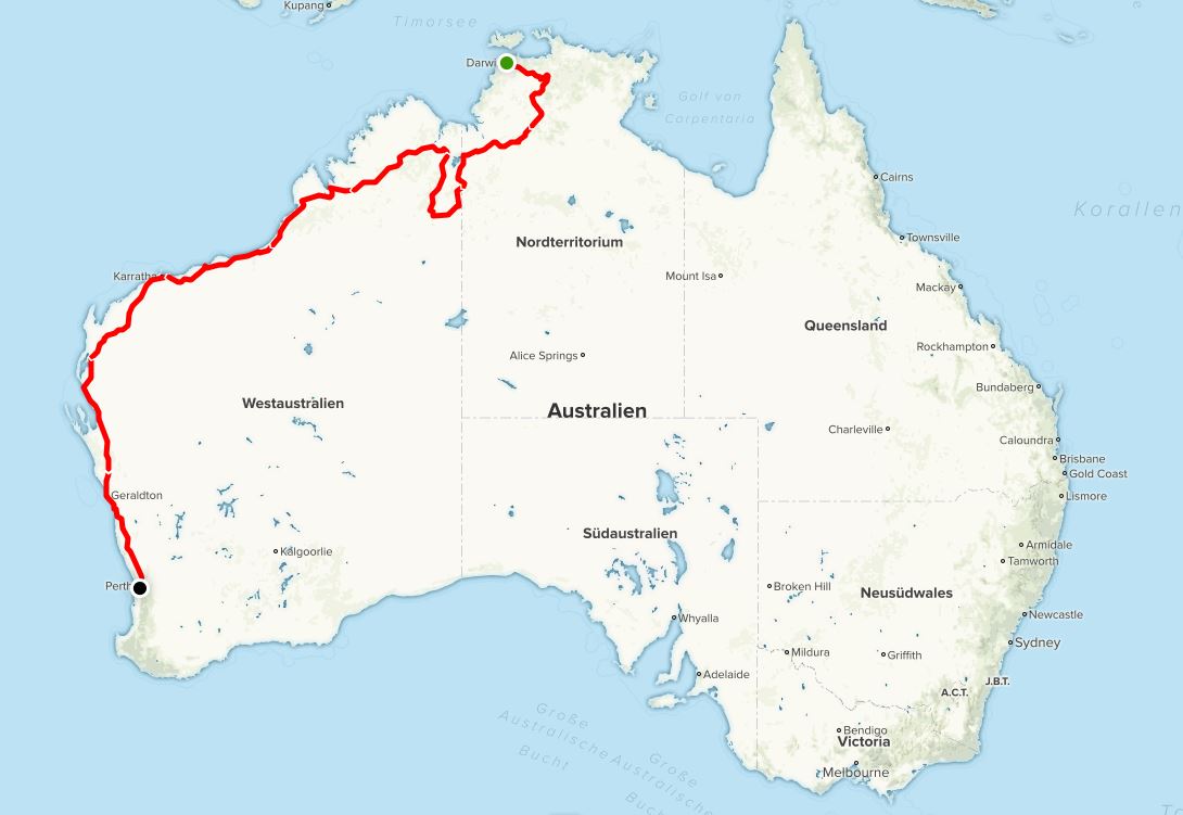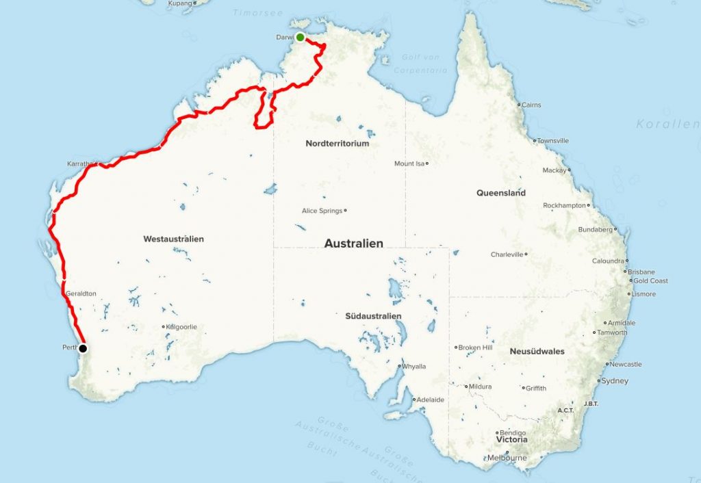 Ab Darwin einen Schleife durch den Kakadu-Nationalpark. Dort über die „Old Jim Jim Road“ zum Kakadu-Highway. Über Pine Creek zum Nitmiluk-Nationalpark, anschließend Richtung Westen über den Highway 1 zur Duncan Road. Das nächste Ziel sind die „Bungle Bungles“ im Purnululu-Nationalpark, bevor es dann wieder Richtung Norden zur Gibb-River-Road geht. Über diesen Track möchte ich dann bis Broome an der Westküste fahren. Nach 25 Tagen geht es dann ab Perth wieder nach Hause.