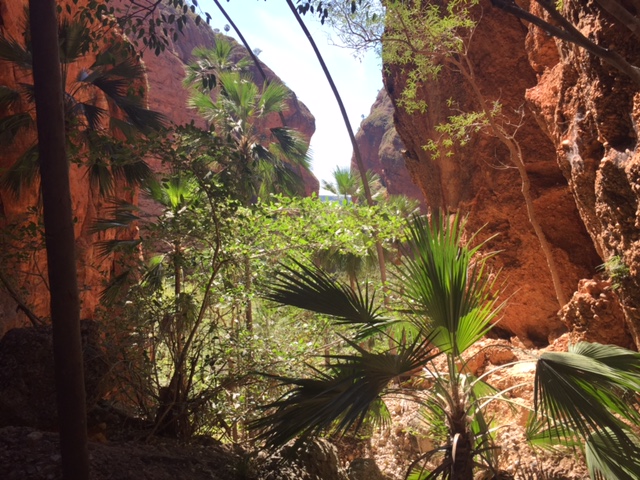Heute bin ich in den Bungle Bungle Nationalpark gefahren. Für 50 Km Zufahrtsstraße habe ich 2,5 Stunden gebraucht. Mehren kleine Flüsse und Flussbetten waren zu durchqueren. So wurde schon die Anfahrt zum ersten Teil des Abenteuers. Ich bleibe eine Nacht im Nationalpark, deshalb habe ich heute den nördlichen Teil des Parks „erwandert“. Zuerst zum Echidna Chasm, eine Schlucht die teilweise nicht mehr als 1m breit ist. Das einfallende Sonnenlicht macht den Weg zusätzlich zum besonderen Erlebnis. Danach bin ich noch zu den „Mini Palms“ gegangen, eine etwas breitere, aber nicht weniger beeindruckende Schlucht. Während ich diese Zeilen tippe, fliegen einige Kakudus über den Zeltplatz und machen Krach. RUHE! 😀 Das sind Probleme… Ehrlich, ich möchte nicht ein Geräusch missen.