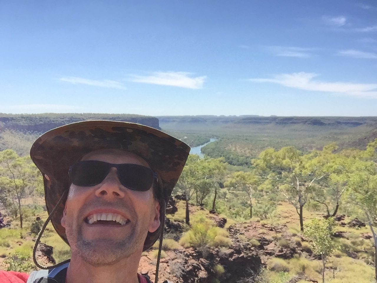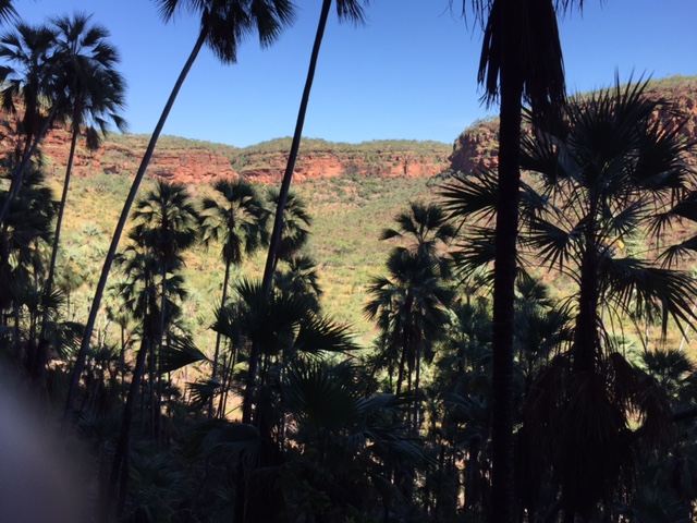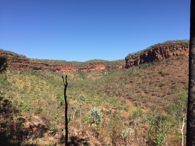Die ersten 1000 Kilometer sind abgespult,, heute kamen noch mal 400 dazu. In der Mitte der Route Katherine – Lake Argyle liegt der Gregory-Nationalpark. Ich habe mir dort zwei kurze Wanderungen ausgesucht. Zuerst auf einen Hügel, oben ein fantastischer Ausblick auf den Victoria-River. Eigentlich ein bisschen bekloppt, die Tour in der Mittagshitze zu machen. Aber 1,5 Stunden und zwei Liter Wasser später war ich wieder unten. Danach noch eine kurze Runde durch ein Seitental. Erst recht öde Vegetation, aber an den Felswänden Palmen und Farn. Alles innerhalb weniger Meter, cooles Erlebnis.